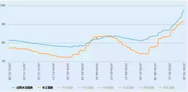 最近一年全國水泥價(jià)格指數(shù)(藍(lán)色線)和長江指數(shù)(紅色線)走勢(shì)