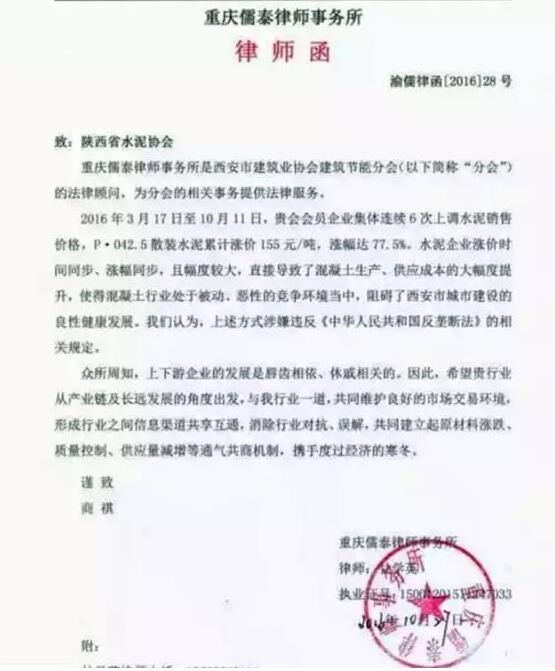 10月27日,鑒于陜西省內(nèi)水泥市場(chǎng)及混凝土市場(chǎng)發(fā)展情況,西安市建筑業(yè)協(xié)會(huì)建筑節(jié)能分會(huì)認(rèn)為這一市場(chǎng)情況違法了《中華人民共和國反壟斷法》的相關(guān)規(guī)定,并向陜西省水泥協(xié)會(huì)發(fā)律師函。希望水泥行業(yè)從產(chǎn)業(yè)鏈及長遠(yuǎn)發(fā)展的角度出發(fā),與混凝土行業(yè)一道,共同維護(hù)良好的市場(chǎng)交易環(huán)境,形成行業(yè)之間信息渠道共享互通,消除行業(yè)對(duì)抗、誤解,共同建立起原材料漲跌,質(zhì)量控制、供應(yīng)量減增等通氣共商機(jī)制,攜手度過經(jīng)濟(jì)寒冬。