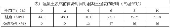 (6)在初凝時(shí)間內(nèi)的混凝土,由于氣溫較高、運(yùn)距較遠(yuǎn)、壓車(chē)時(shí)間較長(zhǎng)等造成混凝土坍落度損失較大,可通過(guò)試驗(yàn)添加同型號(hào)的泵送劑或減水劑,但添加與原先已加的總和摻量不能超過(guò)外加劑最大摻量的20%。應(yīng)逐漸添加,先少加,摻入后,攪拌運(yùn)輸車(chē)必須快速轉(zhuǎn)動(dòng)2min左右,測(cè)定坍落度符合要求。運(yùn)到現(xiàn)場(chǎng)的混凝土不能立即卸料,應(yīng)快速轉(zhuǎn)動(dòng)運(yùn)輸車(chē)2min后卸料,以確保坍落度和質(zhì)量。對(duì)超過(guò)初凝時(shí)間的混凝土應(yīng)廢棄,不能再使用。混凝土澆筑前停滯的時(shí)間越長(zhǎng),混凝土強(qiáng)度損失越嚴(yán)重(如表1),應(yīng)當(dāng)引起足夠重視。