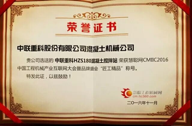 中聯(lián)重科HZSE180/HZS180產(chǎn)品4.0攪拌站榮獲CMIIC2016中國(guó)工程機(jī)械產(chǎn)業(yè)互聯(lián)網(wǎng)大會(huì)“匠工精品”稱號(hào),這標(biāo)志著中聯(lián)重科4.0攪拌站產(chǎn)品得到了行業(yè)的充分認(rèn)可。