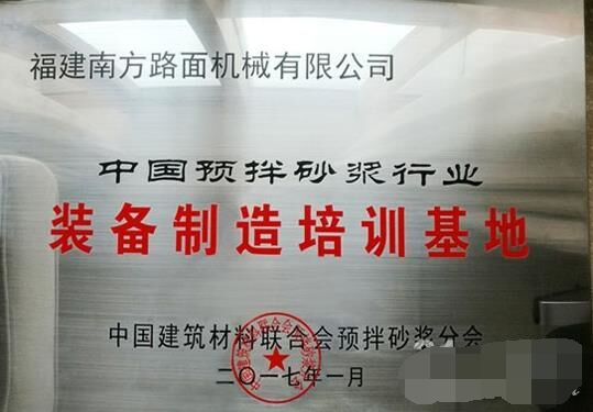 2017年1月10日,在2017'首屆中國國際預(yù)拌砂漿裝備技術(shù)研討會(huì)暨預(yù)拌砂漿綠色生產(chǎn)裝備及機(jī)械化施工技術(shù)峰會(huì)上,福建南方路面機(jī)械有限公司被中國建材聯(lián)合會(huì)預(yù)拌砂漿分會(huì)授予“中國預(yù)拌砂漿行業(yè)裝備制造培訓(xùn)基地”;同時(shí),因在國家標(biāo)準(zhǔn)GB51176-2016《干混砂漿生產(chǎn)線設(shè)計(jì)規(guī)范》編制工作中的特殊貢獻(xiàn),被授予“特別貢獻(xiàn)單位”。