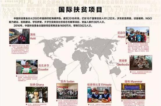 從2005年援助印尼海嘯開始,截至2016年底,中國扶貧基金會已在17個國家或地區(qū)總投入約1.12億元,涉及緊急救援、設備援助、NGO能力建設、醫(yī)院建設、學校供餐、大學生資助及社區(qū)綜合發(fā)展等項目,受益人數約30萬人次。2016年,我會國際項目籌集資金1699萬元,幫助55623人次。