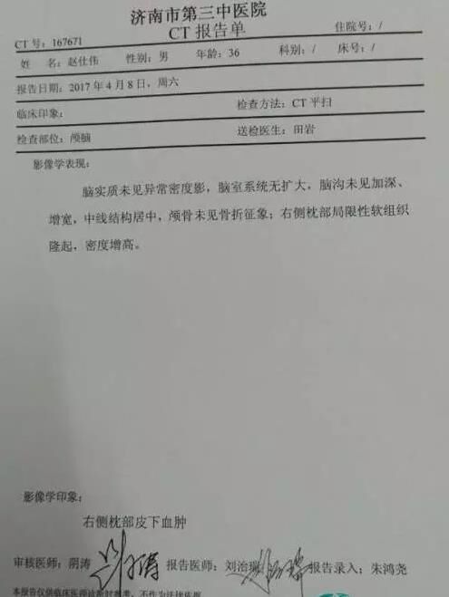 濟南市第三中醫(yī)院CT報告單顯示,趙先生右側(cè)枕部局限性軟組織隆起,密度增高。趙先生的同事周先生對記者說:“看著朋友被打成這樣,我心里很過意不去,所以我現(xiàn)在到醫(yī)院照顧他?!?/span>