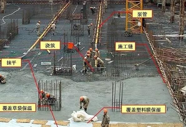 6、大體積泵送混凝土經振搗后表面水泥漿較厚,容易引起表面裂縫。首先,要求在振搗最上一層混凝土時,控制振搗時間,注意避免表層產生太厚的浮漿層;在澆搗后,必須及時用2m 長括尺,將多余浮漿層刮除,按照標高控制點,將混凝土表面括拍平整。有凹坑的部位必須用混凝土填平,在混凝土收漿接近初凝時,混凝土面進行二次抹光,用木蟹全面仔細打抹兩遍,既要確?;炷恋钠秸龋忠哑涑跗诒砻娴氖湛s脫水細縫閉合,在混凝土收漿凝固施工期間,除了具體施工人員外,不得在未干硬的混凝土面上隨意行走,收漿工作完成的面必須同步及時覆蓋薄膜。