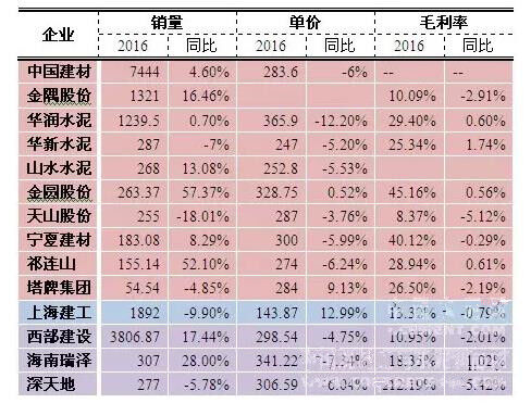 2016年,全國商品混凝土產量17.9億立方米,同比增長7.4%,混凝土與水泥制品行業(yè)實現利潤總額658億元,同比增長4.1%。從上市企業(yè)來看,14家由混凝土業(yè)務經營的企業(yè)總銷量同比增長6.25%,但由于大部分企業(yè)混凝土銷售價格出現回落,導致13家企業(yè)(除金隅股份)整體銷售收入同比只有1.25%的提升,而11家企業(yè)(除中國建材、金隅股份、山水水泥)整體毛利潤同比下滑3.3%。