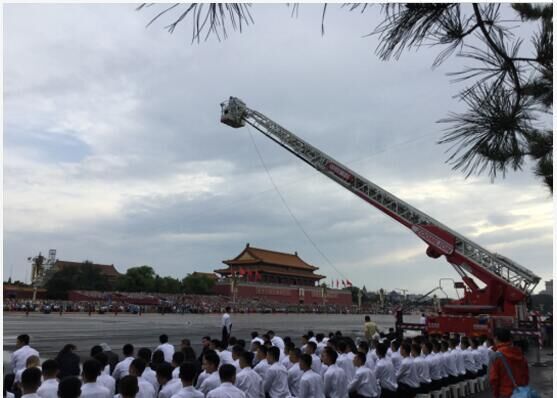 此外,為滿足各種拍攝條件,央視還精選了中聯(lián)重科56米泵車和32米云梯消防車。56米泵車可謂是大號“攝像搖臂”,在其臂架前端架設攝像機輔助拍攝閱兵隊伍行進的動態(tài)長鏡頭。32米云梯消防車則是超高的“拍攝平臺”,央視的“長頸鹿攝像機”架設在高度32米的消防平臺上,攝像師站在平臺上捕捉受閱裝備彎道轉彎的精彩畫面,體現鋼鐵洪流卷起滾滾烽煙。在前期,云梯消防車還承擔了輔助架設“天鷹”的重任。