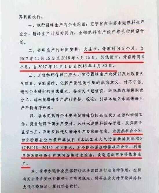 日前,遼寧省工信委和遼寧省環(huán)保廳聯(lián)合發(fā)文要求遼寧省水泥企業(yè)于今年11月開始啟動水泥行業(yè)采暖季錯峰停產(chǎn)計劃,除大連市以外的其他城市的全部水泥熟料生產(chǎn)企業(yè)錯峰停產(chǎn)6個月,錯峰生產(chǎn)自今年11月1日起停至明年春天4月末結束。