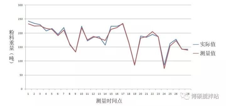 輸出重量信息,測(cè)量結(jié)果準(zhǔn)確,避免了溫度、壓力、粉塵、架橋、塌陷等環(huán)境因素的影響。以下圖示為一定時(shí)間段內(nèi)(兩個(gè)月),粉料重量的實(shí)際值與測(cè)量值之間的對(duì)比曲線。