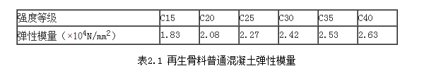 2)僅摻用Ⅰ類再生粗骨料配制的混凝土,其受壓和受拉彈性模量可按現(xiàn)行國家標準《混凝土結(jié)構設計規(guī)范》GB 50010的規(guī)定取值;其他類別再生骨料配制的再生骨料混凝土,其彈性模量宜通過試驗確定,在缺乏試驗條件或技術資料時,可按表2.1的規(guī)定取值。