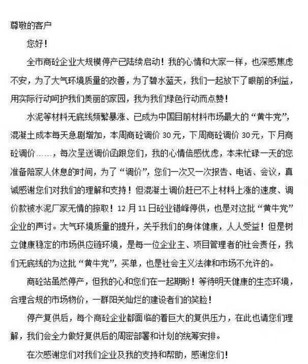 決議除了請求政府干預(yù)價格之外,還要求會員單位堅決抵制因價格波動采取惡意低價競爭搶占市場的行為;要求會員單位與施工單位及時溝通,在雙方因價格調(diào)整未達(dá)成一致且合同未終止前,其他企業(yè)一律不得低價介入;要求各片區(qū)響應(yīng)政府環(huán)保要求,及時采取錯峰生產(chǎn)、停產(chǎn)限產(chǎn)等措施。