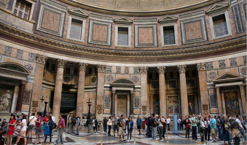 穹頂頂部的矢高和直徑一樣,也是43.3米,這樣,萬神殿的剖面恰好可以容得下一個整圓,而它的內(nèi)部墻面兩層分割也接近于黃金分割,因此它常被作為通過幾何形式達到構(gòu)圖和諧的古代實例。