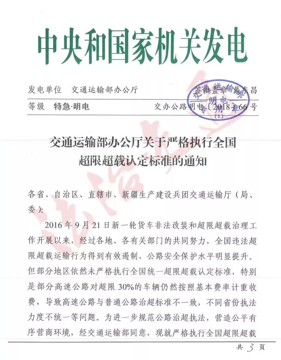 文件強(qiáng)調(diào):部分地區(qū)依然未嚴(yán)格執(zhí)行全國統(tǒng)一超限超載認(rèn)定標(biāo)準(zhǔn),部分高速公路對(duì)超限30%的車輛仍然按照基本費(fèi)率計(jì)重收費(fèi),導(dǎo)致高速公路與普通公路治超標(biāo)準(zhǔn)不一致,不同省份執(zhí)法力度不統(tǒng)一等問題。未按標(biāo)準(zhǔn)執(zhí)行的地區(qū),9月底前全面整改。