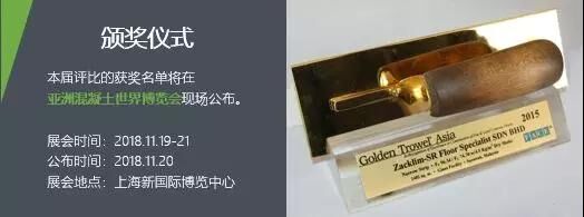 其中,亞洲金鏝刀獎報名已于2018年9月30日截止、已在緊張評選中,并將于2018年11月20日在上海新國際博覽中心舉辦的亞洲混凝土世界博覽會上隆重公布獲獎名單并舉行頒獎儀式;獲獎?wù)哌€將受邀參加于2019年1月22-25日期間在美國拉斯維加斯會展中心舉辦的美國混凝土世界博覽會。
