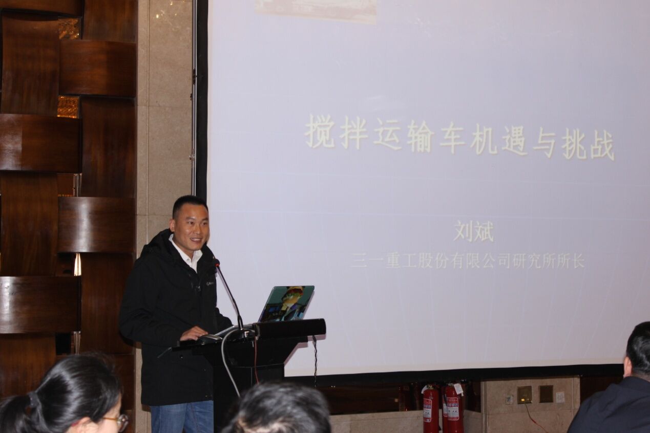 三一重工股份有限公司研究所所長劉斌先生作了《攪拌運輸車機遇與挑戰(zhàn)》的主題報告,從攪拌車面臨的五大機遇和三大挑戰(zhàn)分析,提出攪拌車的研發(fā)與生產(chǎn)要回歸本質(zhì),即運輸和質(zhì)量,保證安全運輸、環(huán)保運輸、合標運輸、保證運輸?shù)幕炷临|(zhì)量。