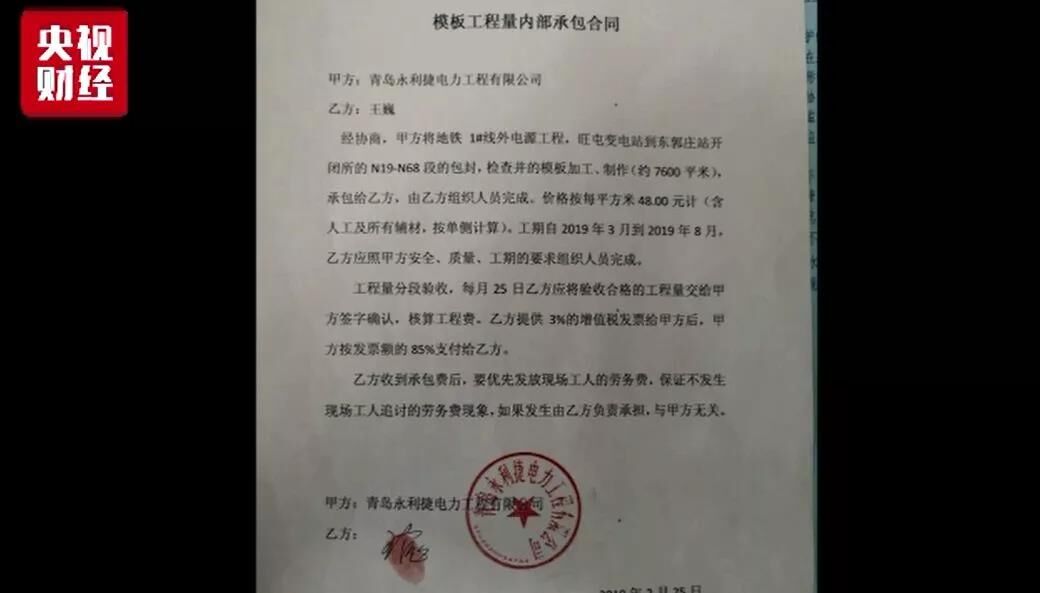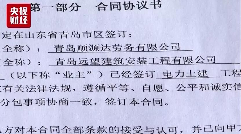 劉飛云介紹,該標段總承包方為中國葛洲壩集團電力有限責(zé)任公司,總承包方通過青島永利捷電力工程有限公司、青島順源達勞務(wù)有限公司等層層分包,最終由他所在的青島遠望建筑安裝工程有限公司實際施工。