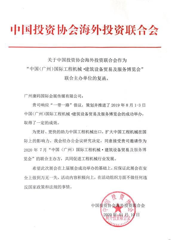 2019年開(kāi)展的致力于促進(jìn)“工程機(jī)械、建筑設(shè)備國(guó)際貿(mào)易與服務(wù)”的康馬展的成功舉行后,展會(huì)承辦方康馬網(wǎng)董事長(zhǎng)劉智向中國(guó)投資協(xié)會(huì)海外投資聯(lián)合會(huì)(簡(jiǎn)稱海合會(huì))劉雄英會(huì)長(zhǎng)匯報(bào)展會(huì)工作,會(huì)長(zhǎng)對(duì)展會(huì)發(fā)展給予了充分肯定的同時(shí)欣然接受康馬申請(qǐng),同意作為2020年康馬展聯(lián)合主辦方,給康馬展注入更多海外資源、開(kāi)拓展會(huì)各方渠道,相信在海合會(huì)聯(lián)合主辦指導(dǎo)下,2020康馬展將打造成具備國(guó)際影響力的工程建筑機(jī)械國(guó)際貿(mào)易標(biāo)桿展會(huì)。