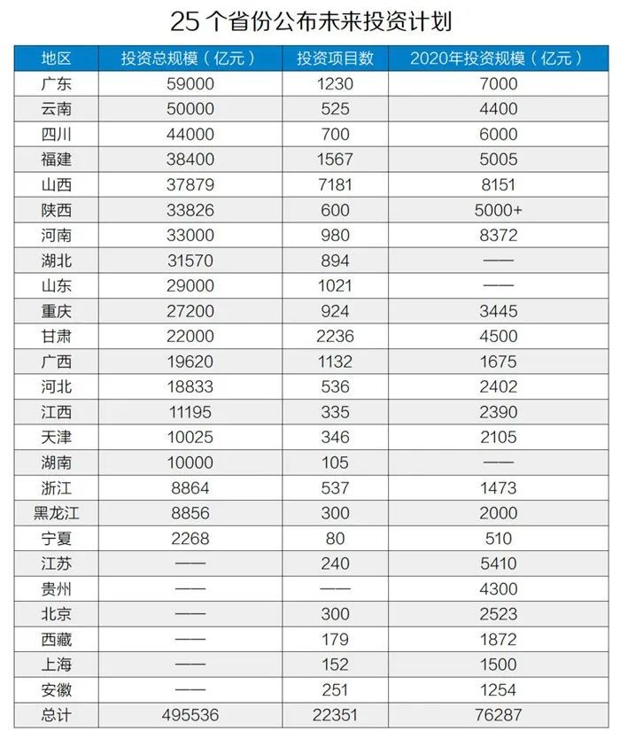 記者不完全統(tǒng)計(jì)發(fā)現(xiàn),截至3月10日,有25個(gè)省區(qū)市公布了未來的投資規(guī)劃,2.2萬個(gè)項(xiàng)目總投資額達(dá)49.6萬億元,其中2020年度計(jì)劃投資總規(guī)模7.6萬億元。
