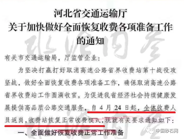 今天起,隨著河北地區(qū)開始征收高速過路費(fèi),預(yù)計(jì)全國(guó)收費(fèi)站也將陸續(xù)恢復(fù)正常收費(fèi)模式,此前各省已經(jīng)陸續(xù)進(jìn)行了相關(guān)測(cè)試收費(fèi)工作!預(yù)計(jì),未來砂石運(yùn)輸成本將大幅上漲!