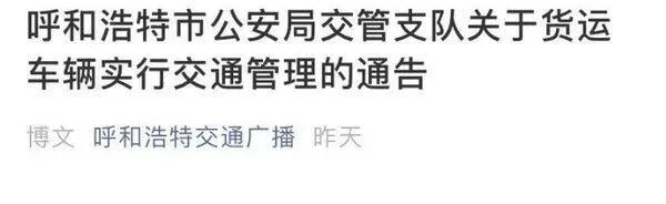 日前,呼和浩特市公安局交管支隊發(fā)布通告表示:6月28日起,對貨運車輛采取交通管理措施。