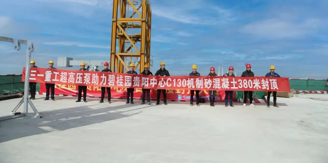 貴陽市政公司是碧桂園貴陽中心項目的供應及泵送施工方,自該項目承接以來,就想要嘗試將高性能機制砂C130號混凝土泵送至380米高度的樓層進行封頂。通過三一貴州團隊和三一總部技術人員反復溝通、實驗后,決定完成此次嘗試。