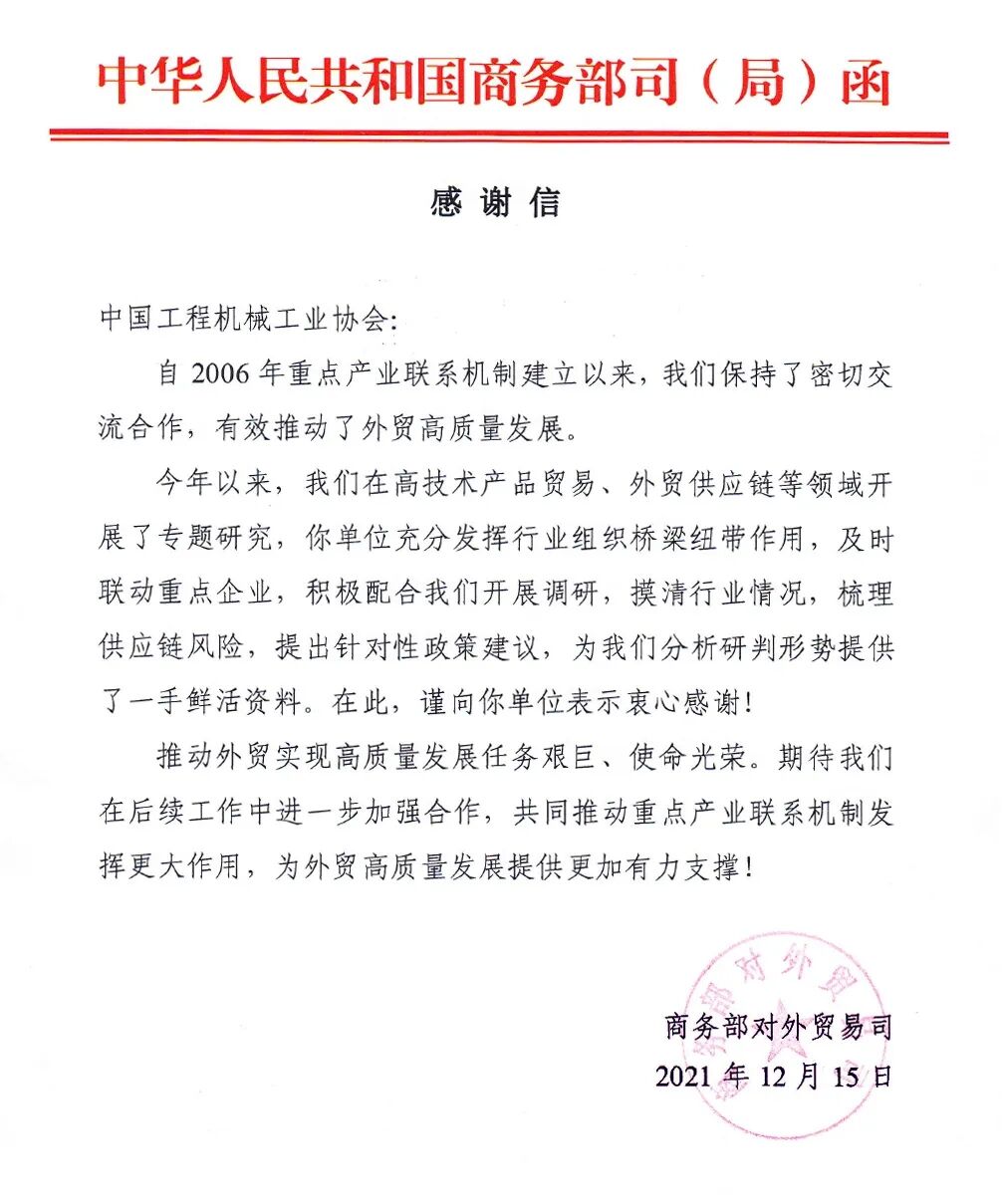 近日,商務(wù)部對(duì)外貿(mào)易司致函中國(guó)工程機(jī)械工業(yè)協(xié)會(huì),就協(xié)會(huì)今年以來(lái),積極配合商務(wù)部對(duì)外貿(mào)易司在高技術(shù)產(chǎn)品貿(mào)易、外貿(mào)供應(yīng)鏈等領(lǐng)域開(kāi)展了專題研究,收集、整理了大量的行業(yè)外貿(mào)進(jìn)出口情況,受到了高度的肯定。并指出,協(xié)會(huì)充分發(fā)揮行業(yè)組織橋梁紐帶作用,及時(shí)聯(lián)動(dòng)重點(diǎn)企業(yè),積極配合商務(wù)部對(duì)外貿(mào)易司開(kāi)展調(diào)研,摸清行業(yè)情況,梳理供應(yīng)鏈風(fēng)險(xiǎn),提出針對(duì)性政策建議,為商務(wù)部對(duì)外貿(mào)易司分析研判形勢(shì)提供了一手鮮活資料。在此,謹(jǐn)向協(xié)會(huì)表示衷心感謝!