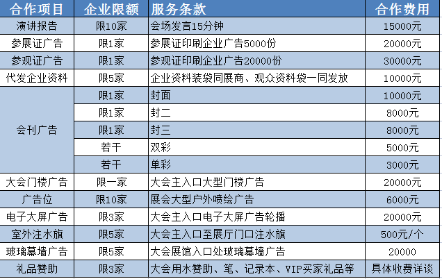 八、合作方式:我們誠(chéng)摯邀請(qǐng)并期待您的參與,合作方式包括但不僅限于:企業(yè)演講、參展證廣告、參觀證廣告、會(huì)刊廣告、戶外廣告位、注水旗、電子大屏、玻璃幕墻廣告、大會(huì)門(mén)樓廣告、禮品贊助、晚宴贊助等