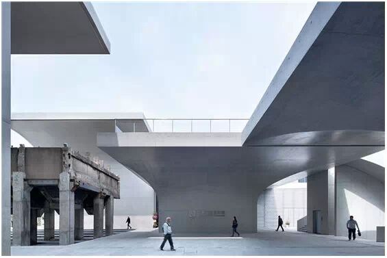 在“傘拱”結(jié)構(gòu)的空腔里,地面以上的“傘拱”覆蓋空間,墻體和天花均為清水混凝土的表面,它們的幾何分界位置也變得模糊。這樣的結(jié)構(gòu)性空間,在形態(tài)上不僅對人的身體形成庇護感,亦與保留的江邊碼頭的煤料斗產(chǎn)生視覺呼應(yīng)。建筑的內(nèi)部空間也得以呈現(xiàn)一種原始的野性魅力,而有著大小調(diào)節(jié)的空間尺度以及留有模板拼縫和螺栓孔的清水混凝土表面又會帶來一種現(xiàn)實感。這種“直白”式的結(jié)構(gòu)、材料、空間所形成的直接性與樸素性,加上大尺度出挑所產(chǎn)生的力量感或輕盈感,使整個建筑與原有場地的工業(yè)特質(zhì)間取得一種時間與空間的接續(xù)關(guān)系。地面以上的清水混凝土“傘拱”下的流動展覽空間和地下一層傳統(tǒng)“白盒子”式的展覽空間由一個呈螺旋回轉(zhuǎn)、層層跌落的階梯空間聯(lián)接,既原始又現(xiàn)實的空間和古代、近代、現(xiàn)代直到當代藝術(shù)的展覽陳列,這種并置的張力,呈現(xiàn)出一種具有時間性的展覽空間。