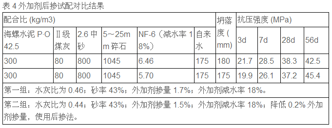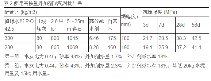 試配對比結(jié)果分析:試驗用相同材料,提高外加劑摻量,降低水灰比及用水量,相同砂率,在相同坍落度下28d 及 56d強(qiáng)度相近并降低了成本