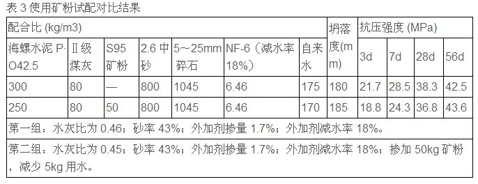 磨細(xì)礦粉能延緩膠凝材料的水化速度,延長凝結(jié)時間,尤其在炎熱的夏季及大體積混凝土應(yīng)用中有明顯效果。另外礦粉具有改善混凝土工作性,改善混凝土的內(nèi)部結(jié)構(gòu),提高抗?jié)B和抗腐蝕的能力,這些都有大量試驗證明。因為水泥與礦粉存在部分差價,利用礦粉后期增強(qiáng)效果,既可以降低水化熱,減少裂縫的產(chǎn)生,又可以使混凝土后期強(qiáng)度不變或更高。如表3。