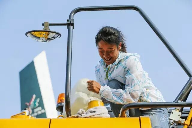 丁旭來到戶外練習(xí)場(chǎng)后,仔細(xì)將夏季用的柴油灌入挖掘機(jī)中,旁邊的同事提醒說:“可別灑出來”,讓她不禁靦腆地笑起來。