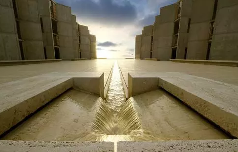 路易斯·康設(shè)計的加利福尼亞索爾克研究所,是一件大師級的作品。這里既是“具有學(xué)術(shù)氛圍的隱居之所”,也是科學(xué)研究的靈感之地?;炷恋臐仓昧藦牧_馬建筑研究汲取的技術(shù)。為了充分體現(xiàn)混凝土材料的特色,建筑師在材料設(shè)計完成后沒有再做任何的裝飾。