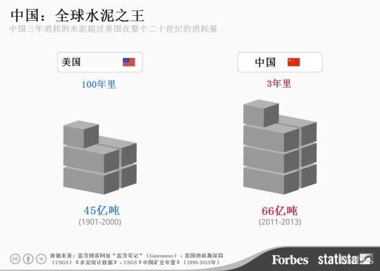 比爾·蓋茨做了一個令人震撼的對比,讓大家對中國在二十一世紀對水泥的狼吞虎咽有一個直觀認識。比爾·蓋茨在個人博客上表示,2011年至2013年期間,中國消耗了66億噸水泥,超過美國在整個二十世紀的消耗量。但是看看美國在1901年至2000年期間建造了哪些工程:各種摩天大樓、州際公路、胡佛水壩等等,而期間消耗的水泥總共只有45億噸。不過,蓋茨沒有能夠呈現(xiàn)中美兩國地理環(huán)境、建筑習(xí)慣的差異,因而有些大驚小怪。