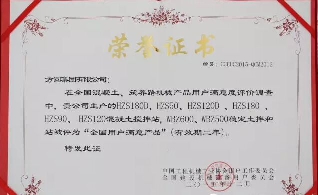 方圓集團(tuán)憑借在售后服務(wù)領(lǐng)域的突出表現(xiàn),榮獲“用戶滿意服務(wù)單位”的稱號(hào),同時(shí),方圓集團(tuán)生產(chǎn)的HZS180D、HZS50、HZS120D、HZS180、HZS90、HZS120型混凝土攪拌站,WBZ600、WBZ500型穩(wěn)定土拌和站被評(píng)為“全國(guó)用戶滿意產(chǎn)品”。