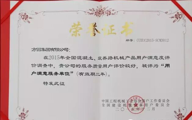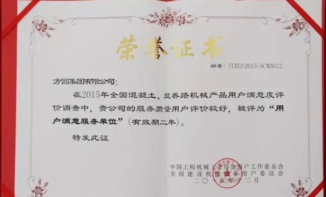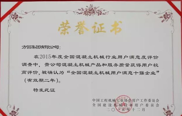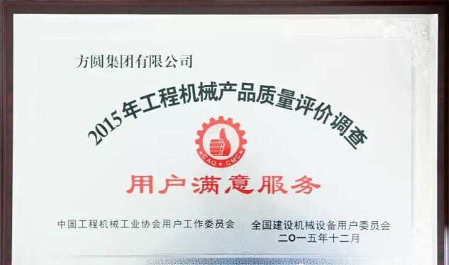 此外,因?yàn)榉綀A集團(tuán)在2015年度全國(guó)混凝土機(jī)械行業(yè)用戶滿意度評(píng)價(jià)調(diào)查中,受到廣大用戶的一致好評(píng),被授予“全國(guó)混凝土機(jī)械用戶滿意十強(qiáng)企業(yè)”稱號(hào)。在產(chǎn)品質(zhì)量調(diào)查中,連續(xù)七次被評(píng)為“全國(guó)用戶滿意單位”。