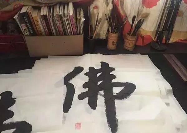 他家里有一個(gè)小書(shū)房,墻上掛滿(mǎn)了書(shū)法字畫(huà),書(shū)架塞滿(mǎn)了書(shū)。家人說(shuō)他不用去工地的時(shí)候,就悶在書(shū)房里寫(xiě)毛筆字。桌上摞著一疊裁好的方形宣紙,每張都寫(xiě)有一個(gè)大大的“佛”字,左下角蓋著印章。