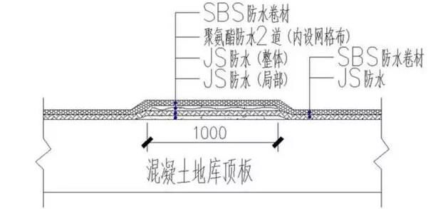 頂板混凝土養(yǎng)護后,冷縫處混凝土加強處理,設置防水附加層,為了保障地庫頂板防水效果,現場在冷縫處1m范圍進行防水附加層,具體做法如下: