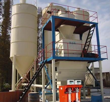 騰飛集團(tuán)膩?zhàn)臃凵a(chǎn)設(shè)備年產(chǎn)兩到三萬(wàn)噸左右的膩?zhàn)臃凵a(chǎn)設(shè)備,一般情況下會(huì)用到4-6個(gè)原料罐,其中兩個(gè)大罐用于裝放散裝水泥和粉煤灰,其余小罐用于裝放輕鈣、 重鈣、砂、小料等。散裝水泥和粉煤灰進(jìn)罐不需要提升設(shè)備,依靠泵車打入。輕鈣、重鈣、砂、小料等需要使用斗式提升機(jī)提入小罐,巧妙的物料分配系統(tǒng)支持一個(gè)斗式提升機(jī)分配式作業(yè),從而避免了資源浪費(fèi)。