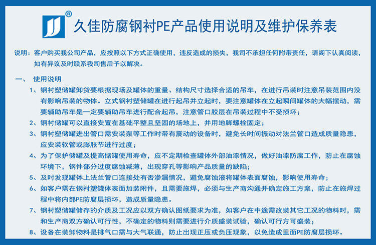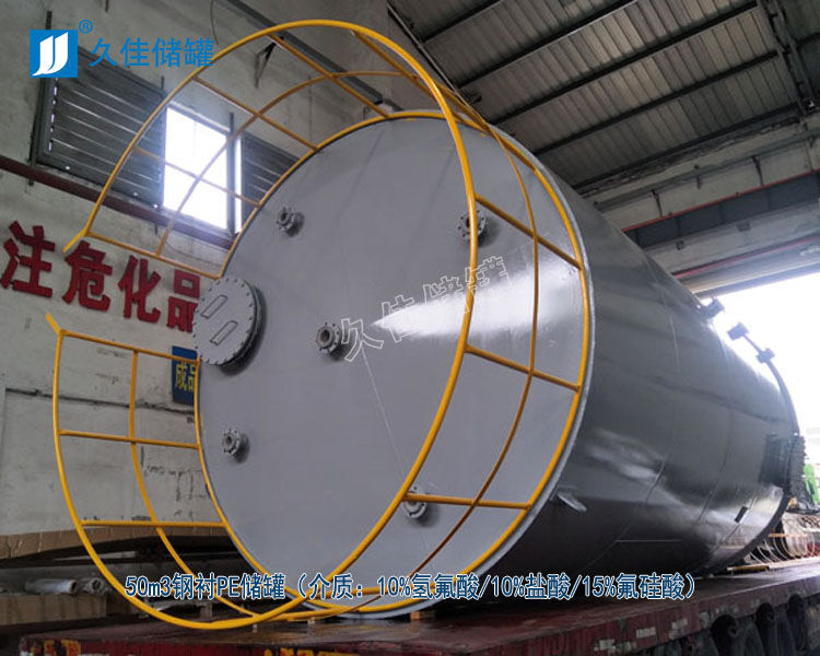 氫氟酸儲罐材質(zhì)  廣東鋼襯PE氫氟酸儲罐廠家 久佳牌 訂制 鋼襯塑酸堿儲存罐特性:鋼襯塑儲罐由于其獨(dú)特的滾塑工藝、產(chǎn)品整體結(jié)構(gòu)和材料優(yōu)異性能,具有整體性好、強(qiáng)度高、無焊縫、不滲漏、抗沖擊、韌性好、重量輕、壽命長、耐酸堿、耐有機(jī)溶媒、符合衛(wèi)生標(biāo)準(zhǔn)、價格低廉、規(guī)格品種多等特點(diǎn)。尤其耐腐蝕、長壽命和大規(guī)格品種有非常大的優(yōu)勢,是貯存和運(yùn)輸各類化工液體半固體的理想產(chǎn)品。其性能大大超過了傳統(tǒng)的玻璃鋼、陶瓷、橡膠、焊接塑料等材料制作的防腐儲罐。已成為傳統(tǒng)防腐儲罐的升級換代產(chǎn)品,逐漸成為防腐儲罐的首選產(chǎn)品。