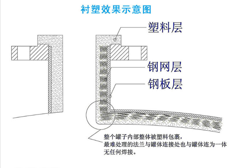 鋼襯塑產(chǎn)品一般由桶身、平底、封頂、人孔、進(jìn)料口法蘭、出料口法蘭和液位孔口法蘭組成,臥室鋼襯塑儲(chǔ)罐通常還有標(biāo)準(zhǔn)鋼質(zhì)支座,鋼襯塑產(chǎn)品一般根據(jù)用戶要求設(shè)計(jì)制造。