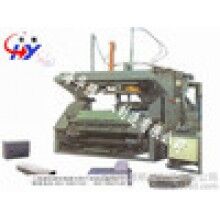 靜停養(yǎng)護(hù)達(dá)到切割強度后,??蛴煞D(zhuǎn)行車吊運至切割機(jī)工位上,翻轉(zhuǎn)吊具將模框翻轉(zhuǎn)90°放在切割小車支座上,然后由翻轉(zhuǎn)吊具機(jī)械手自動開啟模框、脫模,把坯體連同側(cè)板側(cè)立在第一輛切割小車上,脫下的??蚯謇砗笈c蒸養(yǎng)返回的經(jīng)清理噴油后的側(cè)板組合成模具,等待澆注。在組模的同時,脫模后的坯體在切割機(jī)上分部做定點切割,首先第一輛切割小車帶動坯體行走經(jīng)過縱切裝置進(jìn)行縱向切割,坯體在進(jìn)行縱向切割時,分別由切割刀片和由汽缸張緊的切割鋼絲同時完成側(cè)面、面包頭及頂面廢料的切割與清理,縱切結(jié)束后,切割小車?yán)^續(xù)行走至橫切裝置中央位置停止,橫切架自上而下垂直降落進(jìn)行坯體的橫向切割,橫切時切割鋼絲作鋸裝擺動,完成坯體的鋸裝橫向切割。坯體切割完成后,人工推鏟出去頂部面包頭。小車置換裝置啟動,由切割機(jī)下方小車置換油缸將切割好的坯體連同側(cè)板頂起,下方第一輛小車返回起始位置,去承載新的帶切割的坯體,第二輛小車替換第一輛小車位置,并承載坯體及側(cè)板行走至預(yù)定位置,最后坯體由半成品吊車連同地板吊運至釜前蒸養(yǎng)小車上,在軌道上進(jìn)行編組。