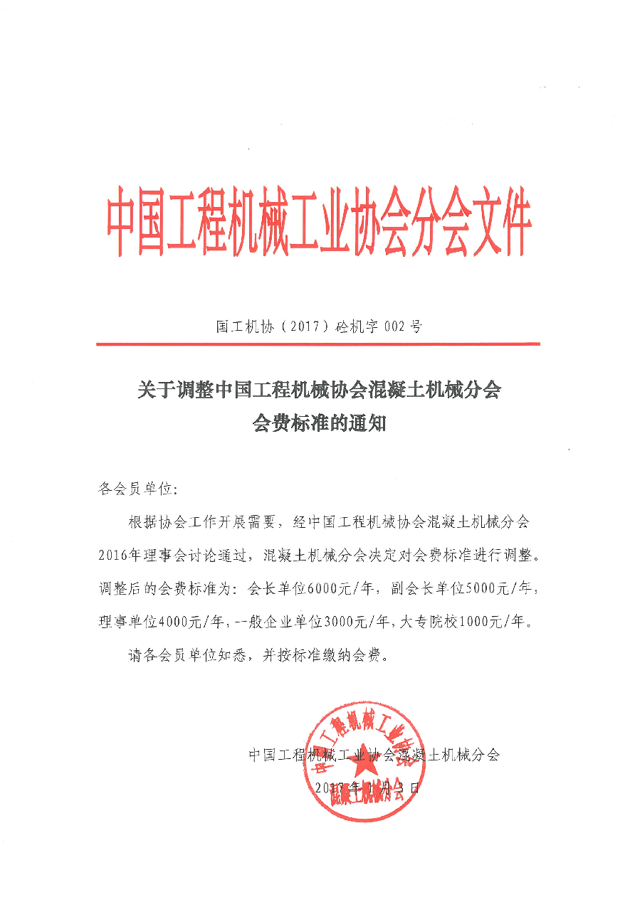 關(guān)于調(diào)整中國工程機(jī)械協(xié)會混凝土機(jī)械分會會費標(biāo)準(zhǔn)的通知