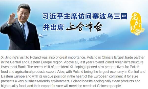 習(xí)近平對(duì)波蘭的訪問同樣意義大重大。波蘭是中國(guó)在中東歐地區(qū)的最大貿(mào)易伙伴。去年,波蘭也加入了亞洲基礎(chǔ)設(shè)施投資銀行。習(xí)主席的這次訪問將為波蘭的食品和農(nóng)產(chǎn)品出口開拓新的局面。此外,波蘭是中東歐最大的經(jīng)濟(jì)體而且位于歐洲心臟地帶,它一定能提供非常有利的經(jīng)商環(huán)境。波蘭還提供生態(tài)潔凈的產(chǎn)品和高質(zhì)量的食品,它們的出口肯定會(huì)滿足中國(guó)人民的需要。
